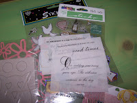 On board SO TWEET chipboard set from SU;- 1 sheet of Lace cardstock-by KI memories (boquet cosmo);Daily Dose-metal signs;-Little labels by Karen Foster Designs;2 sets of petal pebbles by petals and possibilities;-1 sheet-Suzy Zoo stickers;-1 pkg. metallic frame labels by Martha Steward and 1 flower sticker-not sure of maker but think it is Penny black sticker;-6 sheets of Noahs ark papers by Debbie Mum and 6 corinating pieces of chipboard; a few Vellum sheets and some Wedding stickers. Also not shown : I will be adding in some images for you to color as well: -and also your choice of 2 SQUIGGLEFLY images will be sent to you (paid for by me!)--And I ma;y add more items as we go, so Good luck!!!